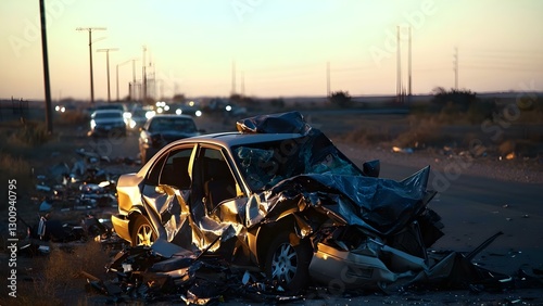 A damaged car on a roadside littered with debris, illuminated by the setting sun and distant vehicles in the background. Concept Damaged Car, Roadside Debris, Setting Sun, Distant Vehicles