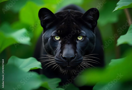 A Dangerous black panther in green leaves, jungle, portrait, hyper realistic image professional documental photography, diffused pale light.