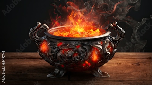 A dark and mysterious cauldron sits on a wooden table. The cauldron is filled with a glowing red liquid.