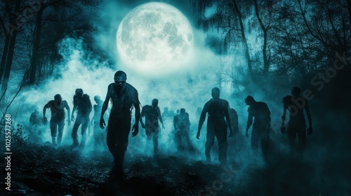 A dark, eerie scene featuring shadowy figures walking under a full moon in a foggy forest.