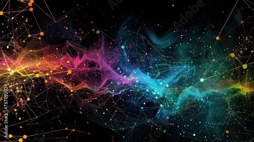 a dark illustration of a technical system with colorful lines connecting different flow states