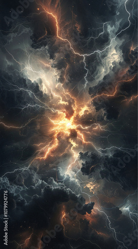 A dark, starry sky with lightning and thunder, with an explosion of energy in the center.