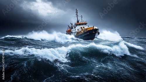 A dark stormy sea with massive waves crashing against a lone ship