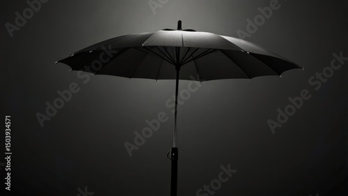 A dark umbrella against a dark background. Dramatic lighting highlights the umbrella
