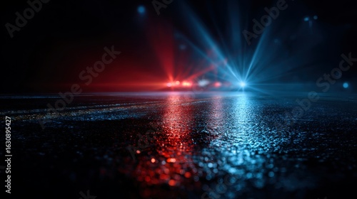 A dark wet surface reflecting red and blue lights creating a moody and atmospheric scene effect