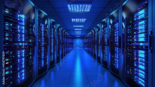 A data center interior with rows of servers blinking lights indicating constant processing state-of-the-art cooling systems ensuring optimal performance AI-driven algorithms managing data flow and