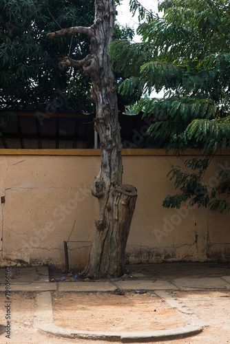 a dead tree standing in a brick planter, ouagadougou, burkina faso