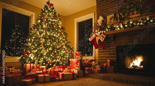A decorated tree sparkles beside a fireplace, surrounded by wrapped gifts, creating a heartwarming holiday atmosphere.