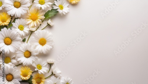 a delicate border of pristine daisies arranged on a soft off white backdrop creating a charming and elegant floral frame perfect for various design applications