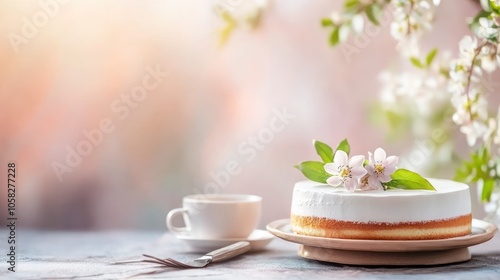 A delicate cake adorned with flowers beside a cup, set against a soft, floral background.
