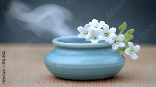 A delicate ceramic bowl filled with white blossoms, emitting gentle steam.