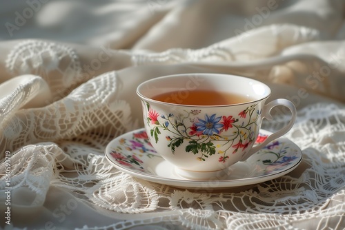 A delicate floral tea cup resting on a lace tablecloth, capturing the essence of tranquility and relaxation.