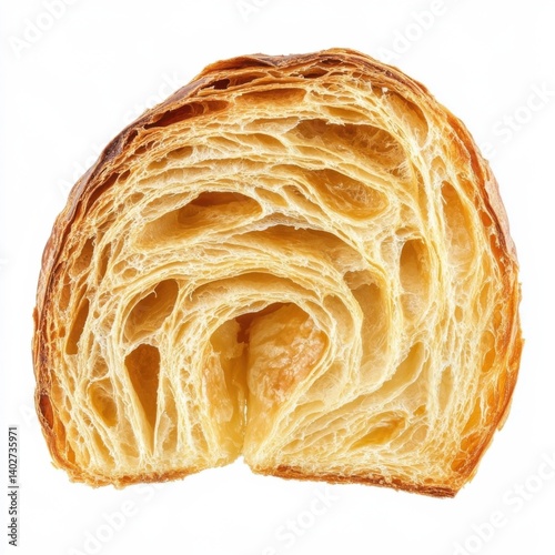 A delicate golden croissant with layers visible on the cut side, isolated white background, hyperrealism art style