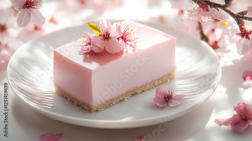 A delicate pink dessert adorned with blossoming cherry flowers sits on a white plate, evoking springtime elegance.