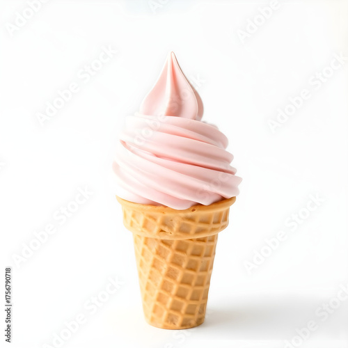 A delicate pink pistachio ice cream swirled into a crisp waffle cone stands upright on a pristine white background.