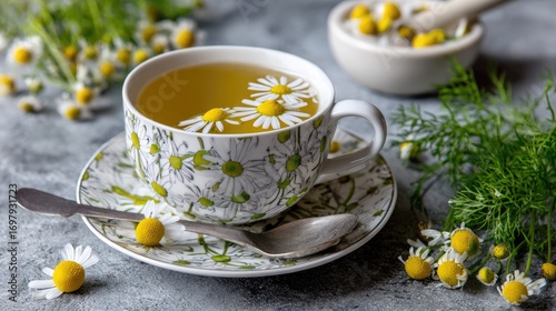 A delicate tea cup filled with chamomile tea, adorned with fresh chamomile flowers. The soothing beverage highlights a calming atmosphere with fresh greens, perfect for relaxation.