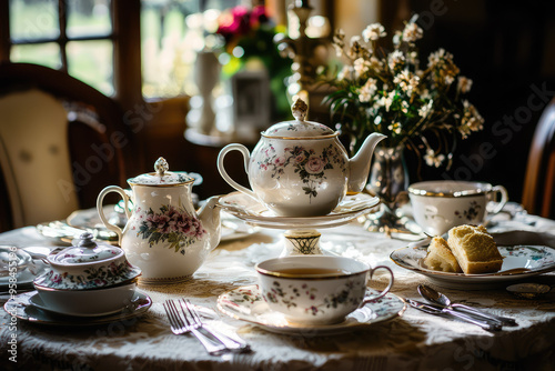 A delicate tea set awaits, adorned with floral patterns, promising a moment of tranquility and warmth.