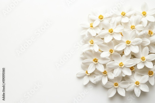 A delicate white flower featuring vibrant yellow centers is elegantly placed on a pristine white surface, creating a serene and harmonious visual effect.