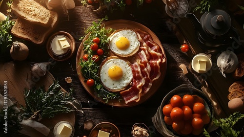 A delicious breakfast spread featuring eggs, bacon, and fresh vegetables on a rustic wooden table