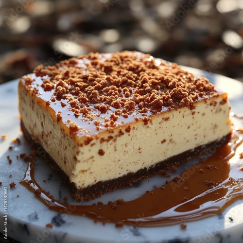 A delicious dessert with creamy layers, rich caramel, and a crunchy topping