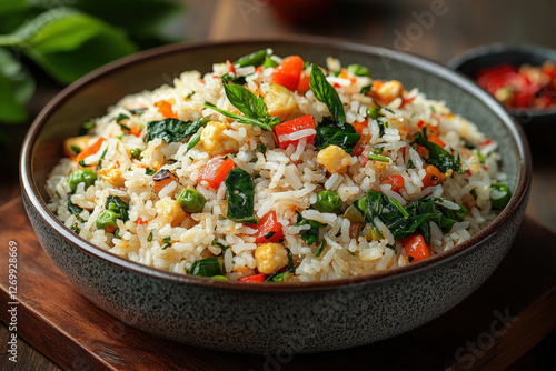 A delicious plate of fried rice with vegetables. The dish consists of fluffy white rice, pieces of bell pepper, green peas, fresh spinach and fried tofu or chicken.