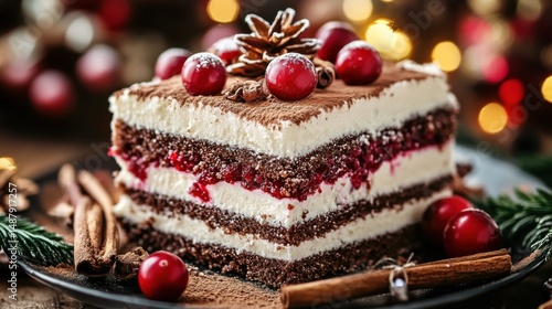 A delicious slice of layered chocolate cake, adorned with cranberries and star anise, sits on a dark plate against a bokeh background of warm Christmas lights. : Generative AI