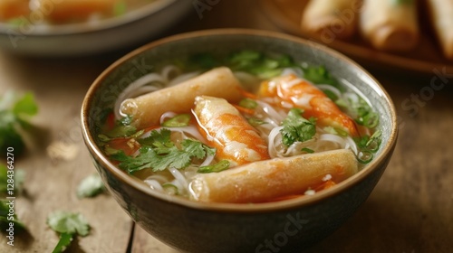 A delicious, traditional Vietnamese beef pho with noodles, herbs, spices, and meatballs. Served in a bowl over a wooden table.