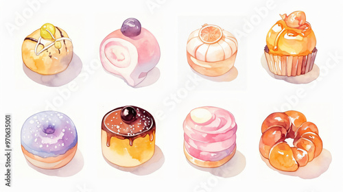 A delightful illustration of various colorful pastries including donuts, cupcakes, and rolls, each uniquely designed, creating a mouth-watering display.