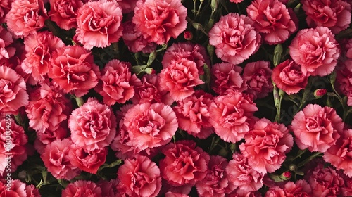 a dense cluster of pink carnations. The flowers are in full bloom, displaying layers of ruffled petals. The background is filled with these blossoms, creating a vibrant and lush floral pattern.