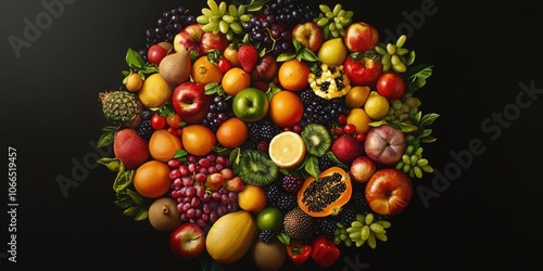 A depiction showcasing an assortment of fruits meticulously arranged in a circular layout against a solid background, emphasizing the variety of fruits in the presentation.