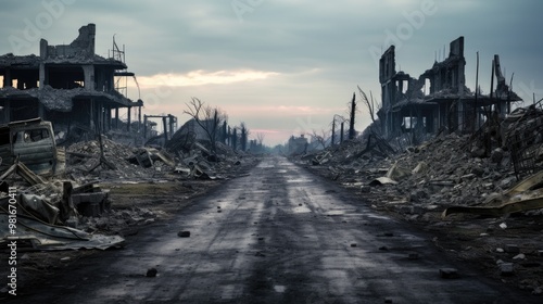 A desolate street lined with the ruins of buildings, a chilling reminder of a past catastrophe.