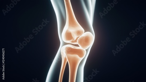 A detailed anatomical illustration of a human knee joint, showcasing its structure and components against a dark background.