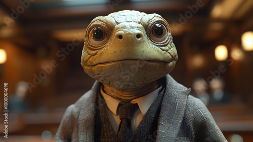 A detailed and whimsical character portrait of a humanoid reptile in formal attire, set in a courtroom environment.