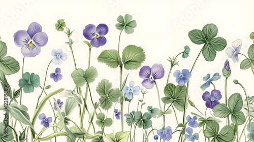 A Detailed Botanical Illustration Featuring Whimsical Violets and Forget-Me-Nots