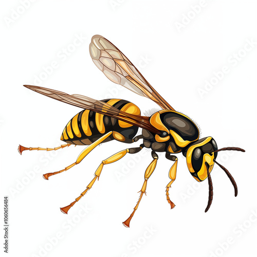 A detailed cartoon illustration of a yellow and black wasp flying through the air