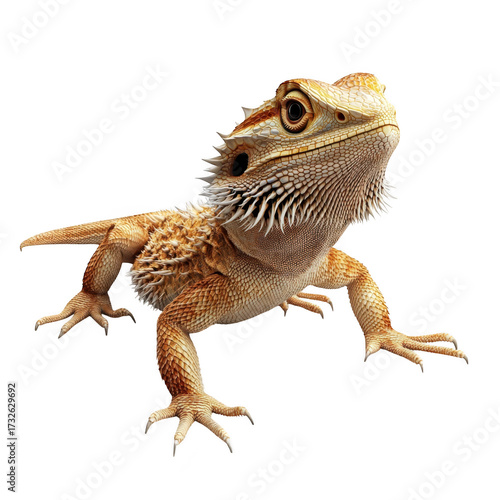 A detailed close-up of a bearded dragon lizard its colors and unique skin texture. posed on a clean white background. ideal for educational or pet care content