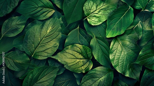 A detailed close-up of a collection of lush green leaves, capturing their texture and patterns. Perfect for nature-themed stock photography.