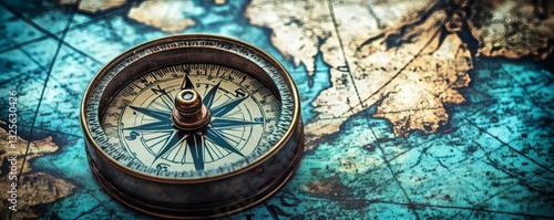 A detailed compass rests on a vintage and worn map