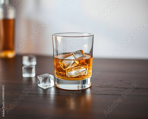 a detailed glass of whiskey on the rocks, amber liquid with ice cubes, glass placed on a wooden table, ambient lighting, shallow depth of field, high resolution, photorealistic