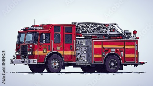 A detailed illustration of a red fire truck with a ladder and various firefighting equipment.