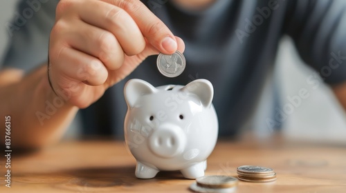 A detailed photo of a man adding a coin to a white piggy bank, illustrating the concept of financial prudence and responsible money management.