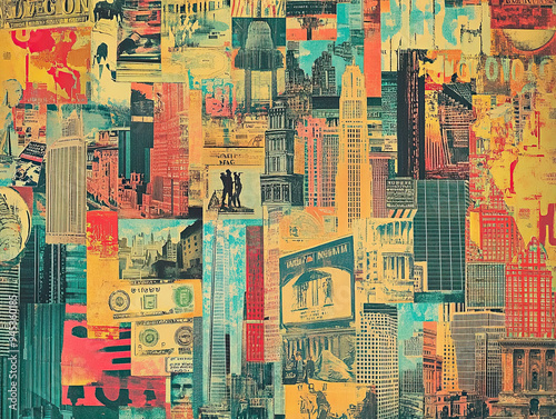 A detailed shot of a retro American poster from the 1960s showcasing the rise of the stock market with images of corporate buildings, financial symbols