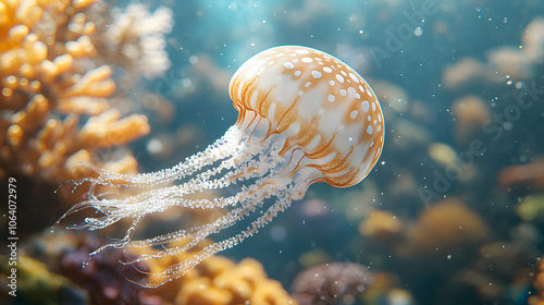 A Detailed Visualization of a Cubomedusa Jellyfish Gliding Through a Vibrant Coral Reef in a Tropical Sea
