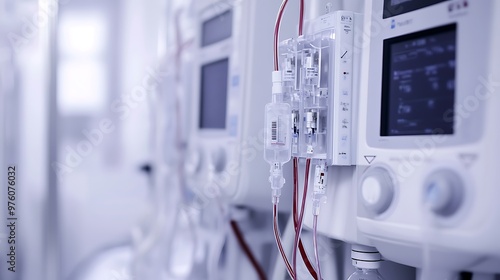 A dialysis machine in use, with the focus on the tubes and blood flow during the treatment process.