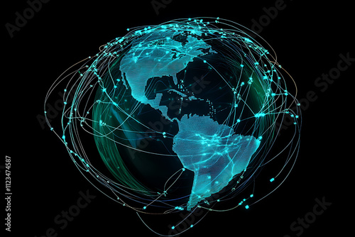 A digital art illustration of a worldwide network connection, featuring glowing lines and dots spanning a globe