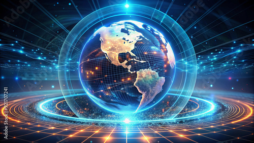 A digital globe with vibrant lights highlights Earth amidst a backdrop of tech-driven data visualization