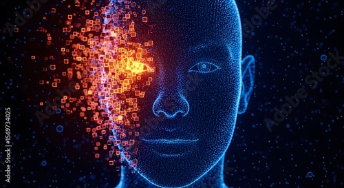 A digital human face with one side dissolving into glowing orange particles. Concept of AI, digital transformation, virtual identity, or data processing.