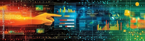 A digital interface displays data visualizations and graphs, with a hand pointing at interactive elements, illustrating technology and analytics.