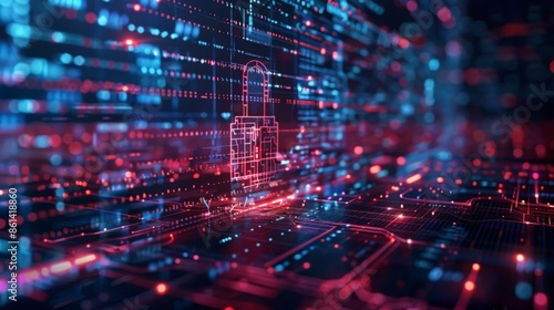 A digital rendering featuring a lock symbol with a background of blue and red circuits, representing cybersecurity.