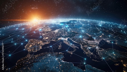 A digital rendering showcases Earth at sunrise, with a network of illuminated lines connecting various locations, primarily across Europe and parts of Africa, highlighting global connectivity